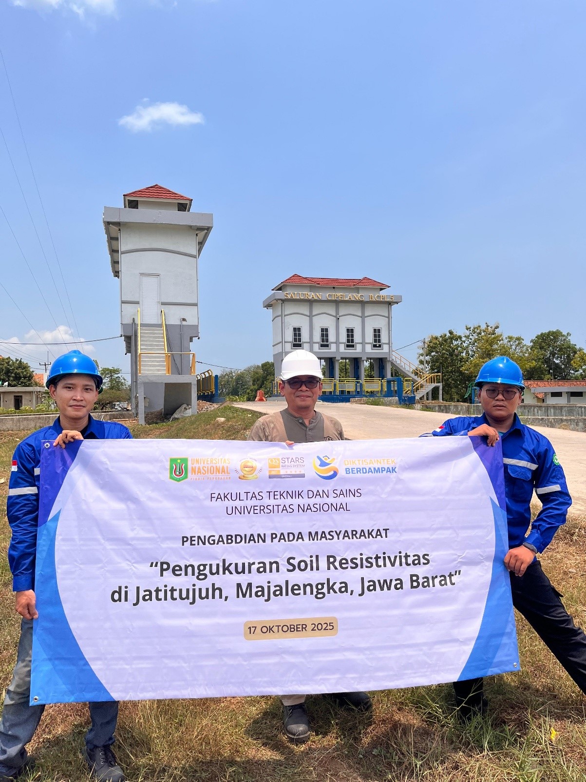 Fakultas Teknik dan Sains (FTS) Universitas Nasional melaksanakan kegiatan Pengabdian kepada Masyarakat dengan tema “Uji Soil Resistivity sebagai Dasar Keandalan Sistem Listrik dan Proteksi Petir”. Kegiatan ini berlangsung selama tiga hari, mulai tanggal 15 hingga 17 Oktober 2025, di area irigasi bentang yang mencakup wilayah Kabupaten Indramayu dan Majalengka, Jawa Barat.
